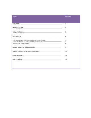 Este documento explora los ecosistemas. Define un ecosistema como una unidad formada por factores bióticos (seres vivos) y abióticos (factores físicos) que interactúan en un espacio determinado. Explica que existen tres tipos principales de ecosistemas: aéreos, acuáticos y terrestres. Además, describe los componentes y factores de un ecosistema, así como los diversos seres vivos que habitan en ellos y cumplen funciones específicas dentro de la red trófica.