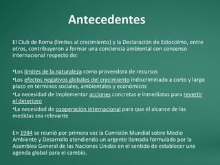 El informe Nuestro Futuro Común de 1987 estableció el concepto de desarrollo sostenible como aquel que satisface las necesidades del presente sin comprometer las necesidades de las futuras generaciones. Identificó problemas como el crecimiento poblacional, la pobreza, la crisis energética, la pérdida de biodiversidad y el conflicto urbano, y propuso soluciones como el uso eficiente de recursos y la distribución equitativa de alimentos.
