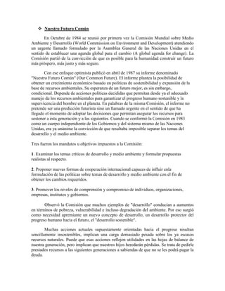 El documento habla sobre el informe "Nuestro Futuro Común" publicado en 1987 por la Comisión Mundial sobre Medio Ambiente y Desarrollo de la ONU. El informe define el desarrollo sostenible como aquel que satisface las necesidades del presente sin comprometer las necesidades de las futuras generaciones. También analiza temas como la población, alimentación, energía, industria y medio ambiente de las ciudades, e insta a los gobiernos a adoptar políticas para garantizar un desarrollo sostenible.