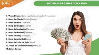El plan de compensación 9inario de Aplgo ofrece 11 formas de ganar, incluyendo bonos por venta directa, grupo, y un sistema de igualación, con potencial de ingresos de hasta $10,000 semanales. Los asociados pueden ascender mediante la compra de paquetes, y los beneficios aumentan con el estatus, ofreciendo mayores porcentajes en comisiones y regalías. Además, incorpora bonos de actividad, estilo de vida y entretenimiento, promoviendo un enfoque en el crecimiento y la lealtad a largo plazo.