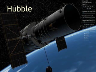 El documento resume las principales imágenes tomadas por el Telescopio Espacial Hubble, incluyendo galaxias como la Galaxia del Sombrero y nebulosas como la Nebulosa de la Hormiga. Luego describe brevemente otros objetos astronómicos como planetas, estrellas y agujeros negros fotografiados por Hubble. Finalmente, incluye una reflexión sobre la fragilidad e insignificancia de la Tierra cuando se ve desde la perspectiva del universo.