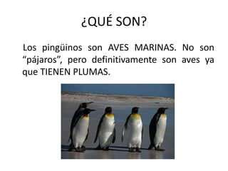 Los pingüinos son aves marinas no voladoras que habitan principalmente en la Antártida y se caracterizan por tener plumas y nadar en lugar de volar. Se alimentan de cangrejos, peces, calamares y camarones, y sus alas han evolucionado en aletas para bucear. Las parejas de pingüinos cuidan de sus crías, conocido como pichones, y existen diferentes especies, como el pingüino de Adelia y el pingüino rey.