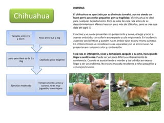 El documento presenta información sobre varias razas de perros. Se describen brevemente el origen, características y temperamento del chihuahua, golden retriever, labrador retriever, maltés, mastín español, mastín napolitano, pastor alemán, rottweiler y yorkshire terrier.