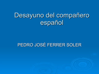 El documento presenta los desayunos típicos de tres estudiantes de España y Portugal como parte de un proyecto eTwinning. Se describe el desayuno del estudiante español Pedro José que consiste en cereales Chocapic con leche. La estudiante portuguesa Isabela desayuna pan, mantequilla, yogur de fresa y zumo de naranja. La española Celia desayuna pan con nocilla y yogurt o zumo de naranja. Cada uno también incluye una fotografía de su cocina.