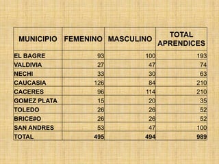 Este documento presenta información sobre diferentes proyectos productivos y unidades productivas desarrolladas en 2009 a través del Programa de Jóvenes Rurales Emprendedores. Se detallan capacitaciones realizadas en avicultura, granjas integrales, porcicultura, joyería, agricultura y piscicultura. También se mencionan comunidades atendidas como indígenas, desplazados y desmovilizados. Se describen proyectos productivos específicos de pollos, porcicultura y piscicultura en diferentes municipios de Antioquia