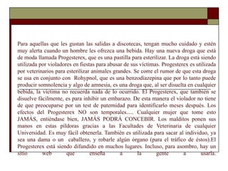 Un médico advierte sobre una nueva droga llamada Progesterex que está siendo usada por violadores en fiestas para abusar de sus víctimas. La droga se disuelve fácilmente en bebidas y causa esterilización permanente en las mujeres. También se usa junto con Rohypnol para causar amnesia y facilitar el robo de órganos.