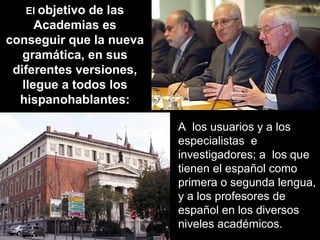 El documento presenta un resumen de la nueva edición de la "Nueva gramática de la lengua española" publicada por la Real Academia Española. Es la primera gramática académica desde 1931 y establece la norma lingüística para los hispanohablantes. El objetivo de las Academias es que la gramática llegue a todos los usuarios y niveles académicos para fijar el uso correcto del idioma español.