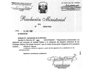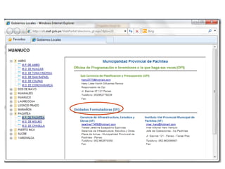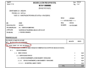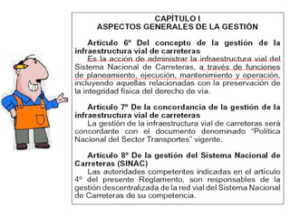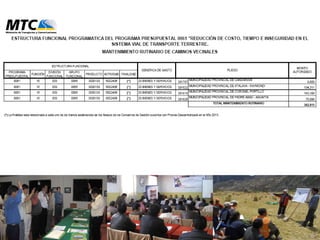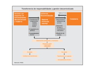 Este documento presenta información sobre la descentralización, la gestión pública y el manejo presupuestario de los institutos viales provinciales en Perú. Explica las leyes y decretos que rigen la descentralización y el presupuesto, así como los pasos para la incorporación, ejecución y control de las transferencias programáticas condicionadas destinadas al mantenimiento vial.