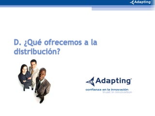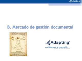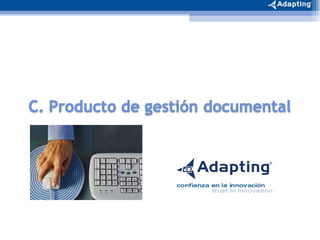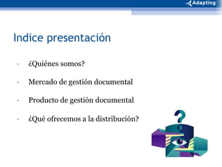 Este documento presenta una nueva plataforma de gestión documental y ECM de Adapting para integrar con distribuidores. Ofrece una solución modular de gestión documental con funcionalidades como gestión de usuarios, carpetas, documentos y expedientes, así como captura de documentos y flujos de trabajo. La plataforma es 100% web, personalizable y escalable, y se puede implementar como un proyecto llave en mano a través de socios distribuidores.