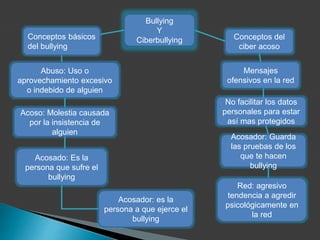 Este documento describe los conceptos básicos de bullying y ciberbullying. Define términos como abuso, acoso, acosador y acosado. Explica las características del bullying directo e indirecto, así como las normas y consecuencias del bullying y ciberbullying. También identifica a los actores clave como acosador, acosado y observadores.