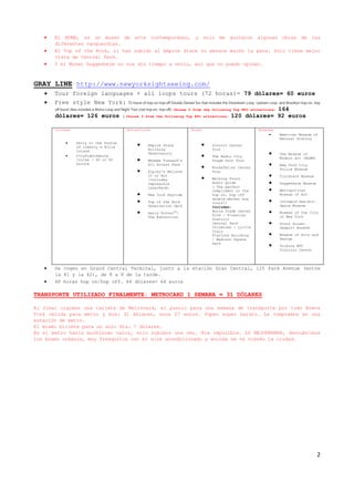 Este documento presenta el itinerario de un viaje a Nueva York, incluyendo información sobre transporte, hoteles, atracciones turísticas y actividades realizadas cada día. Se proporcionan detalles sobre opciones de transporte desde el aeropuerto, un recorrido por varios barrios y lugares emblemáticos como el Empire State, Central Park y el MET. También se incluyen recomendaciones sobre los pases de transporte y atracciones más convenientes para visitar la ciudad.