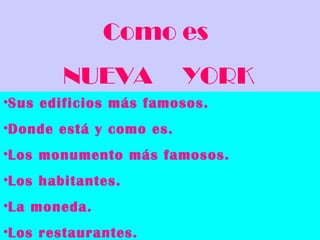 Nueva York es una gran ciudad situada en el noreste de Estados Unidos y está formada por cinco distritos. Algunos de sus edificios más famosos son el Empire State Building, el Rockefeller Center y el Chrysler Building. Los monumentos más conocidos incluyen el Puente de Brooklyn, Times Square y Central Park. La ciudad tiene alrededor de 8.3 millones de habitantes que son conocidos por ser acogedores y serviciales.