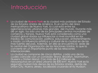 Nueva York es la ciudad más poblada de Estados Unidos y el centro del área metropolitana de Nueva York, una de las aglomeraciones urbanas más grandes del mundo. Durante más de un siglo ha sido un importante centro mundial de comercio, finanzas, medios de comunicación, política, educación, entretenimiento, moda e influencia artística y cultural, además de albergar la sede de las Naciones Unidas.