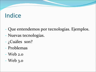 Este documento describe varias nuevas tecnologías como dispositivos móviles multifunción, televisores de alta definición, ordenadores y consolas portátiles, robótica, nanotecnología, aceleradores de partículas y nuevos telescopios. También menciona problemas como la dependencia excesiva de la tecnología, el analfabetismo digital y la invasión de la privacidad. Explica que la Web 2.0 se centra en aplicaciones colaborativas y que la Web 3.0 implicará inteligencia artificial y contenidos