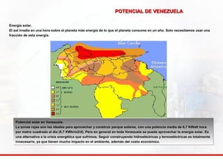 Venezuela tiene un alto potencial para el aprovechamiento de energías alternativas como la solar, eólica, undimotriz y geotermal, lo que podría ofrecer una solución a su crisis energética. Se presenta un análisis del aprovechamiento de recursos naturales como el gas natural, incluyendo el GNL y GNC, para el transporte y distribución eficiente de energía. El país posee infraestructura y tecnología que permitirían procesar y transportar estas energías renovables y gas natural a poblaciones aisladas.
