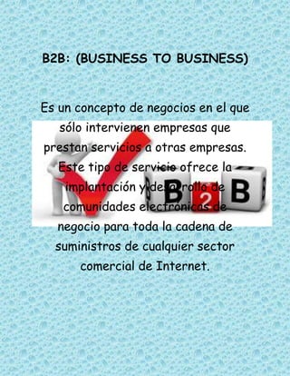 B2B se refiere a negocios entre empresas, donde una empresa ofrece servicios a otra. B2C describe cómo las empresas llegan directamente a los consumidores finales ofreciendo productos y servicios. C2C se refiere al comercio entre individuos, donde las personas realizan transacciones entre sí a través de sitios de subastas y anuncios clasificados.
