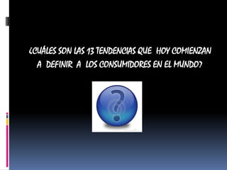 El documento describe 13 tendencias de consumo emergentes a nivel global. Estas incluyen una mayor preocupación por el medio ambiente y el bienestar, el envejecimiento de la población, estilos de vida más móviles, una cultura de comidas rápidas, mayores niveles de estrés, un aumento de personas que viven solas, una demanda de autenticidad y experiencias genuinas, una búsqueda de lujo y diferenciación, una mayor conectividad e influencia del boca a boca, y roles de género que están cambi