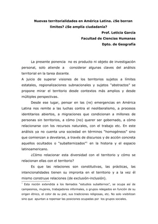 Este documento discute las nuevas territorialidades en América Latina y cómo los límites territoriales y la ciudadanía están cambiando. Señala que los territorios ya no deben verse solo en términos de límites estatales, sino desde perspectivas más amplias que reconozcan la diversidad. También argumenta que los movimientos sociales están construyendo nuevas nociones de territorio y ciudadanía que sobrepasan fronteras estatales e incluyen a grupos previamente excluidos. Finalmente, sugiere que los conceptos de democracia