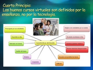Este documento presenta nueve principios para lograr la excelencia en la enseñanza virtual. El primer principio es que el mundo virtual es un medio en sí mismo que requiere desarrollar el sentido de comunidad y presencia social entre los estudiantes. También señala que en la enseñanza virtual el contenido debe ser dinámico y que los buenos cursos se definen por su enseñanza más que por la tecnología. Finalmente, propone diez sugerencias para apoyar a los estudiantes en cursos virtuales como proveer ejemplos de tareas