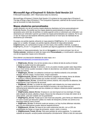 Este documento presenta las nuevas funciones incluidas en Microsoft Age of Empires II: Edición Gold Versión 2.0, que incluye los juegos Age of Empires II: The Age of Kings y Age of Empires II: The Conquerors Expansion. Entre las nuevas funciones se incluyen mapas aleatorios personalizados diseñados por Ensemble Studios, un modo de mapa aleatorio a ciegas para partidas multijugador, y un modo de mapa aleatorio turbo que acelera ciertos aspectos del juego. También incluye tutoriales avanzados, partidas