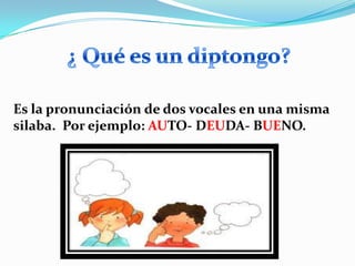 Este documento describe los diptongos, que son la unión de dos vocales en la misma sílaba, como en las palabras "auto" y "bueno". Existen diptongos cerrados con vocales cerradas como "i" y "u", y diptongos abiertos con vocales abiertas como "a", "e" y "o". También presenta ejemplos de palabras que contienen diptongos.
