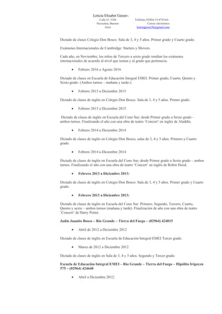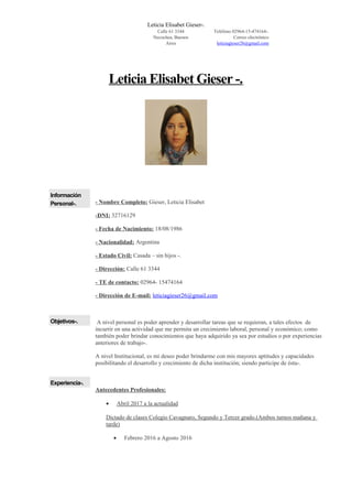 Este documento presenta el currículum vitae de Leticia Elisabet Gieser. Incluye su información personal y de contacto, objetivos profesionales, experiencia laboral como profesora de inglés en varias escuelas desde 2009 hasta la actualidad, educación formal y estudios de inglés, y referencias laborales y personales.