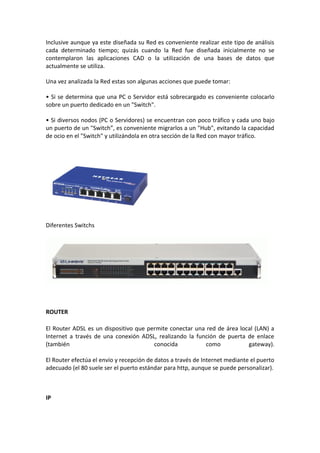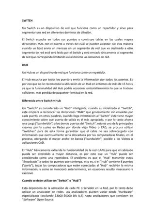 El documento describe las diferencias entre switches y hubs. Los switches segmentan una red en dominios de difusión mediante el mapeo de direcciones MAC a puertos, lo que limita las colisiones. Los hubs envían información por todos los puertos, lo que puede causar embotellamientos en redes grandes. Los switches son más inteligentes al reconocer direcciones MAC y enviar paquetes solo al puerto necesario.