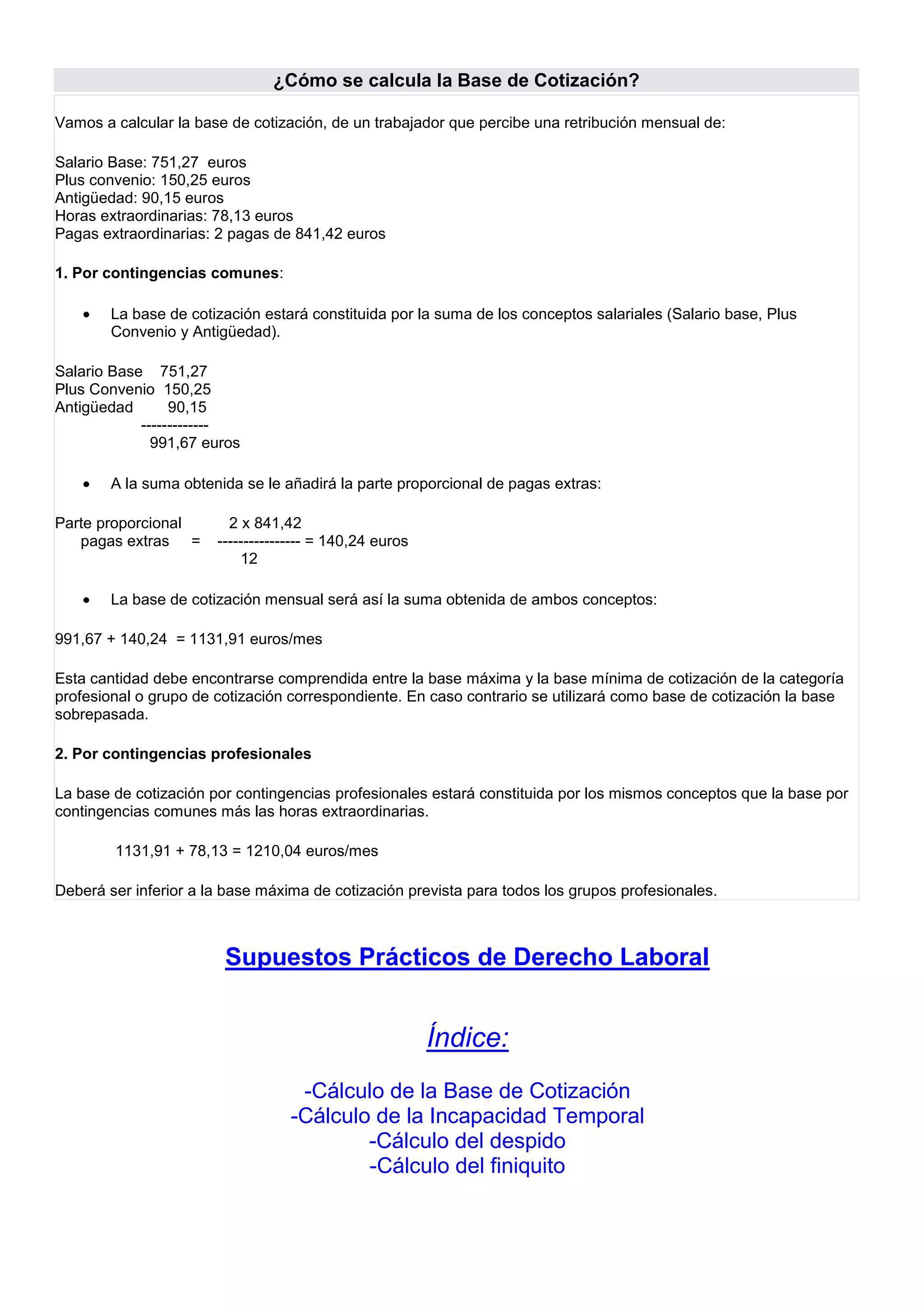 El documento explica cómo se calcula la base de cotización a la Seguridad Social de un trabajador con diferentes conceptos salariales. Se calcula por separado la base de cotización por contingencias comunes y por contingencias profesionales sumando los diferentes salarios y complementos, así como una parte proporcional de las pagas extras.