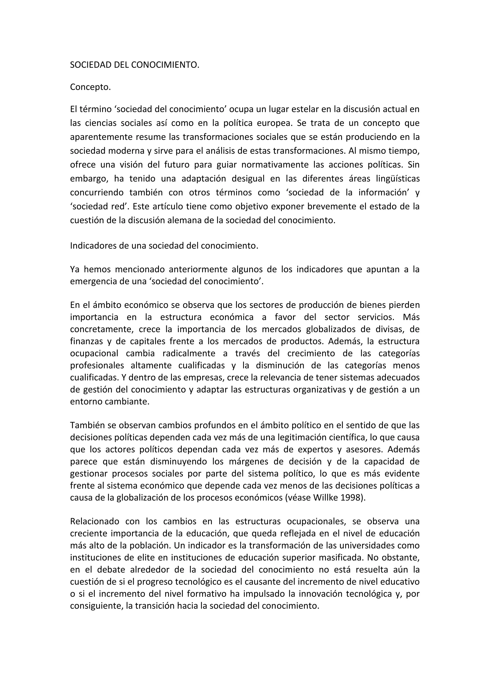 Este documento describe los conceptos clave de una "sociedad del conocimiento" y sus principales indicadores. Explica que la sociedad del conocimiento se refiere a las transformaciones sociales actuales guiadas por el conocimiento. Identifica algunos indicadores clave como el crecimiento del sector de servicios sobre la manufactura, el aumento de trabajos calificados, la dependencia creciente de expertos en la toma de decisiones políticas, la educación superior masificada, y los cambios culturales relacionados con la globalización e Internet.