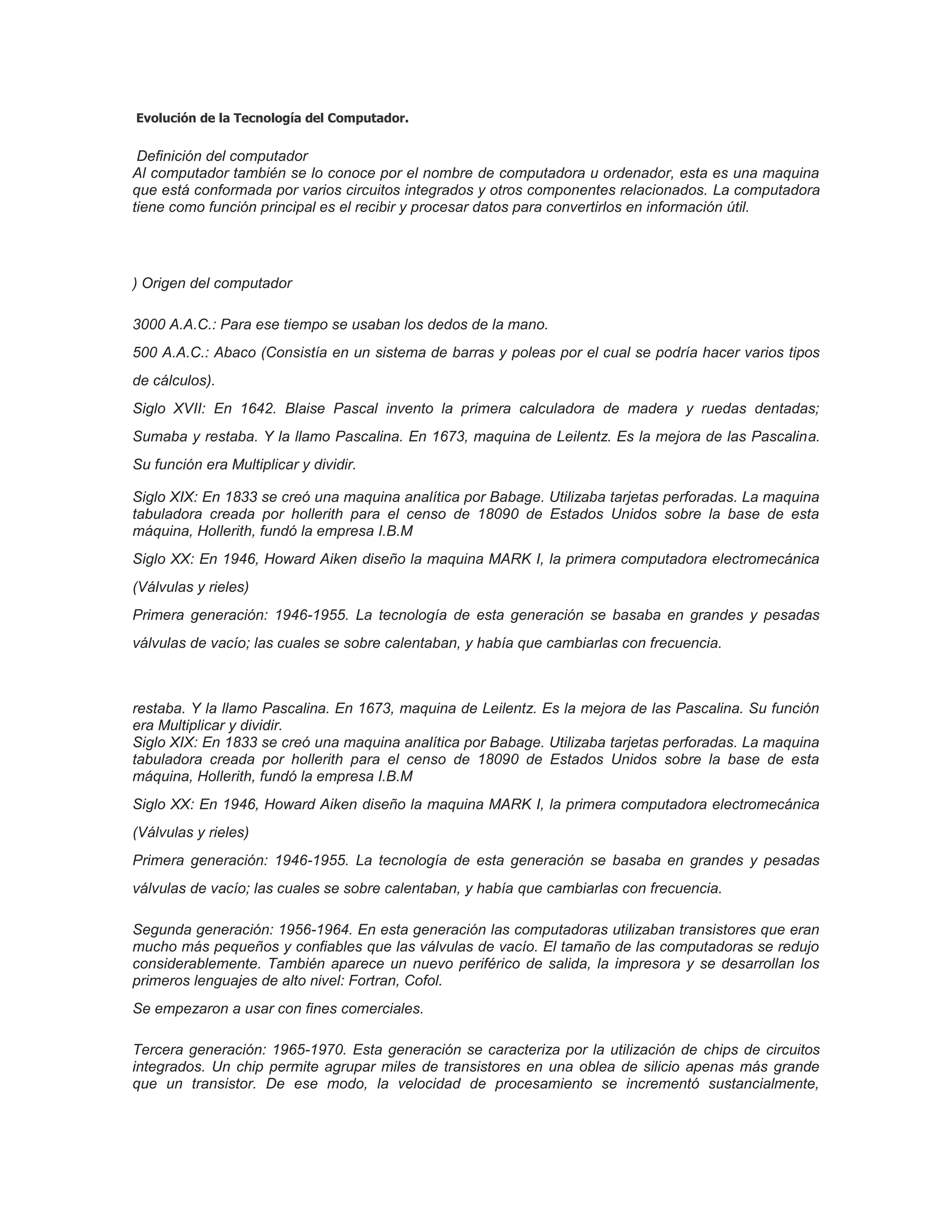 El documento resume la evolución de la tecnología del computador desde sus orígenes en el 3000 A.C. hasta la actualidad. Explica que los primeros dispositivos de cálculo incluían el ábaco y la máquina de Pascal, y que la primera computadora electromecánica fue creada en 1946. Luego describe las primeras tres generaciones de computadoras y los avances clave de cada una, incluido el paso de las válvulas de vacío a los transistores y los circuitos integrados. Finalmente, distingue entre computadoras analógic