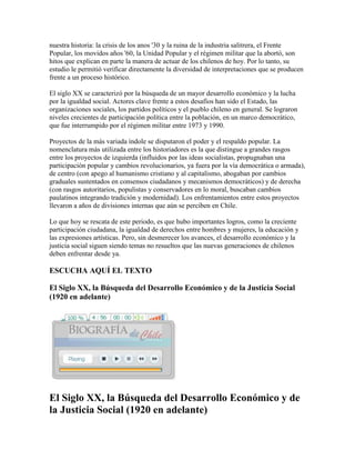 Este documento resume el cuarto periodo de la historia de Chile en el siglo XX, desde 1920 hasta la actualidad. En este periodo, Chile buscó el desarrollo económico y la justicia social a través de la ampliación de los derechos ciudadanos, la reforma agraria, y modelos económicos como la industrialización y el neoliberalismo, a pesar de la inestabilidad política y las violaciones a los derechos humanos bajo la dictadura militar. Aunque hubo avances significativos, como una mayor participación política y dere