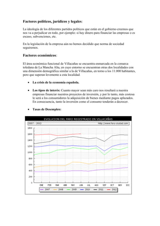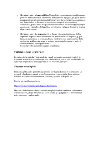 El documento analiza factores políticos, jurídicos, económicos, sociales, tecnológicos y demográficos que afectan al desarrollo de empresas en una región. Entre los factores económicos se encuentran la crisis española, los tipos de interés, el desempleo y las decisiones sobre gasto público e impuestos. Los factores tecnológicos incluyen el acceso a tecnología y proveedores de instrumentos musicales. Finalmente, los alumnos de escuelas de música podrían ser