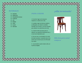 El documento describe los pasos para construir una silla de madera, incluyendo diseñarla primero, cortar las láminas de madera según las medidas, lijar y barnizar las piezas, unirlas con cola y clavos, y finalmente pintar la silla terminada.