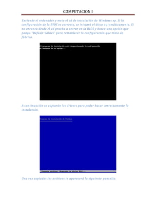 Este documento proporciona instrucciones paso a paso para instalar el sistema operativo Windows XP en un ordenador. Explica cómo iniciar la instalación desde un CD, particionar y formatear el disco duro, completar la configuración inicial incluyendo idioma, nombre de usuario, clave y hora, e instalar actualizaciones. Una vez finalizada la instalación, el escritorio de Windows estará listo para su uso.