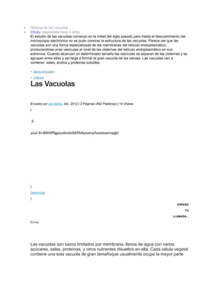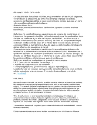 Las vacuolas son orgánulos celulares presentes en las células vegetales y otras eucariotas que almacenan agua y sustancias como sales y azúcares. Se forman a partir de vesículas del retículo endoplasmático y alcanzan un gran tamaño ocupando la mayor parte del volumen de la célula vegetal madura. Cumplen funciones como el mantenimiento de la presión de turgencia, aislamiento de desechos y digestión de macromoléculas.