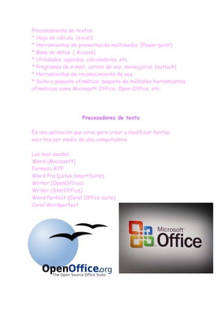 La ofimática incluye técnicas, aplicaciones e herramientas informáticas que se utilizan para optimizar funciones de oficina como la gestión de documentos, datos numéricos, reuniones y cronogramas de trabajo. Las herramientas ofimáticas como procesadores de texto, hojas de cálculo y presentaciones multimedia permiten crear, manipular e intercambiar información necesaria en una oficina de manera conectada a una red. La ofimática tiene como objetivo simplificar y automatizar las actividades de una compañía a través de la organización