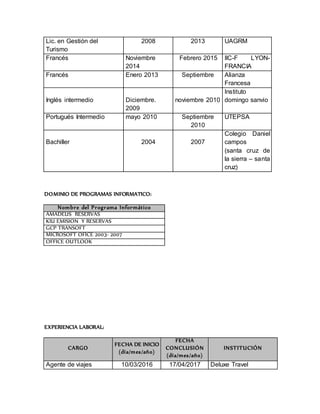 Este currículum vitae detalla la información personal, educación y experiencia laboral de Ibis Francisco Pinedo Rojas. Pinedo Rojas es de Santa Cruz de la Sierra, Bolivia y obtuvo una licenciatura en Gestión del Turismo de la UAGRM. Habla español, portugués, inglés y francés con diferentes niveles de dominio. Tiene experiencia trabajando como agente de viajes, en recepción hotelera y como guía turístico.