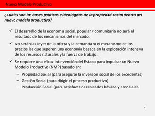 El documento describe las bases del nuevo modelo productivo socialista del siglo XXI en Venezuela. Propone una economía basada en la propiedad, gestión y producción sociales, con el objetivo de satisfacer las necesidades de la población en lugar de buscar lucro. Esto se logrará a través de unidades de propiedad social con los trabajadores, comunidad y Estado como propietarios, y con la intervención estatal para impulsar este modelo a través de incentivos.