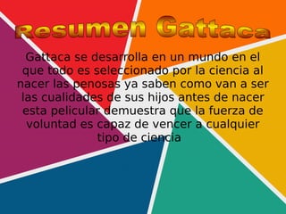 El documento resume tres películas que se han visto y analizado durante el año: Gattaca, Wall-E y una película sin título. Gattaca se desarrolla en un futuro donde la genética determina el destino de las personas. Wall-E cuenta la historia de un robot que recoge basura en la Tierra abandonada y se encuentra con otro robot. La tercera película trata sobre una historia de amor entre dos personas llamadas Otto y Ana que se reencuentran en el círculo polar ártico.