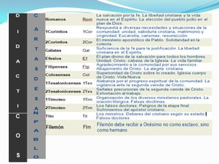 Este documento resume los principales puntos sobre el Nuevo Testamento, incluyendo su división en tres grupos (históricos, didácticos/sapienciales y proféticos), los géneros literarios de los evangelios, y breves descripciones de los cuatro evangelios de Mateo, Marcos, Lucas y Juan.