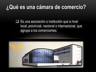 La Cámara de Comercio de Lima es una asociación fundada en 1888 que agrupa a comerciantes e industriales para defender sus intereses. Tiene como objetivos promover el comercio, mejorar las condiciones de los negocios, y fomentar el desarrollo económico del país. Ofrece servicios como capacitación, asesoría legal, y difusión de oportunidades de negocio a sus asociados.