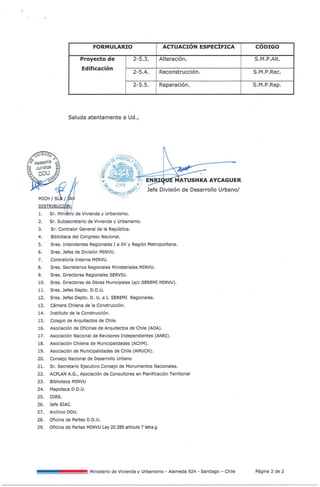 Este documento presenta un resumen de los formularios de solicitud de aprobación de anteproyecto de obras de edificación que deben ser reemplazados. Se indica que los formularios del Grupo 2 distribuidos mediante la Circular DDU 446 contienen notas incorrectas sobre la normativa y umbrales de proyectos que pueden ser revisados por expertos independientes según su categoría. Se enumeran los 12 formularios específicos que deben ser reemplazados y se solicita distribuir los nuevos formularios corregidos.
