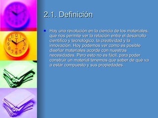 Este documento clasifica y describe los principales tipos de materiales modernos. Los materiales se dividen en 5 categorías: metales, semiconductores, cerámicos, polímeros y compuestos. Los metales son buenos conductores térmicos y eléctricos con alta densidad y ductilidad. Los semiconductores como el silicio son la base de la electrónica. Los cerámicos son aislantes frágiles. Los polímeros como el plástico y caucho se obtienen de monómeros. Los compuestos son materiales híbridos