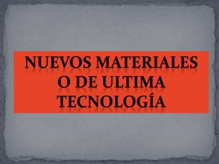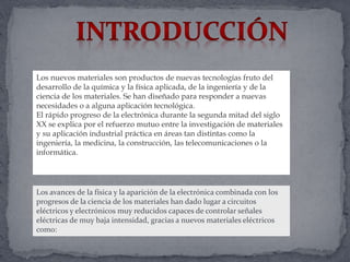 Los nuevos materiales se han desarrollado gracias al progreso de la química, física y ciencia de materiales para responder a nuevas necesidades tecnológicas. El rápido avance de la electrónica en la segunda mitad del siglo XX se debe a la investigación de nuevos materiales y su aplicación industrial en áreas como la ingeniería, medicina y telecomunicaciones. Estos nuevos materiales incluyen semiconductores, materiales piezoeléctricos, compuestos y nanomateriales con propiedades únicas.