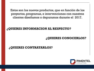 Este documento presenta nuevos productos y servicios de capacitación desarrollados por Pimentel Consultoria durante 2017, incluyendo cursos, seminarios y diplomados sobre temas como reclutamiento, administración de recursos humanos, calidad en el servicio, negociaciones efectivas y administración del tiempo. También describe tres nuevos servicios de instalación de competencias que se ofrecerán en vivo, en línea y con aplicación inmediata. El documento invita a los lectores a contratar estos productos y servicios de capacitación.