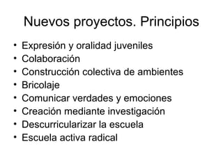 El documento presenta principios para nuevos proyectos educativos que valoran la expresión y oralidad juveniles, la colaboración, y la construcción colectiva de ambientes de aprendizaje. Se propone una escuela activa y radical que promueve la inclusión, participación y el uso de TIC, permitiendo a los estudiantes investigar y construir conocimiento en contextos relevantes para sus vidas. La idea central es descurricularizar la escuela para crear un espacio donde la diversidad y la reflexión crítica sean fundamentales en el proceso educativo.