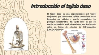 El documento proporciona información sobre el tejido óseo. Explica que el tejido óseo es una especialización del tejido conjuntivo cuya matriz extracelular está mineralizada con fosfato de calcio. Describe las funciones del tejido óseo como proveer sostén y protección debido a su dureza, y regular los niveles de calcio en la sangre. También resume los procesos de formación del hueso, osificación endocondral e intramembranosa, y los componentes estructurales del hueso como la