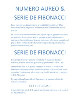 Este documento describe el número áureo y la sucesión de Fibonacci. Explica que el número áureo se encuentra en muchas figuras geométricas y en la naturaleza en proporciones como las ramas de los árboles y la estructura de los cristales. También define la sucesión de Fibonacci como una secuencia numérica donde cada número es la suma de los dos anteriores, y muestra ejemplos de esta secuencia en la concha del nautilus, el aloe y las curvas espirales.