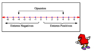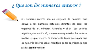 Los números enteros incluyen los números naturales distintos de cero, los números negativos de los naturales y el cero. Son el resultado de las operaciones de suma y resta básicas y no tienen parte decimal, abarcando tanto los números naturales para contar como los negativos generados por restar un número mayor a uno natural.