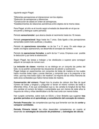 Este documento discute las perspectivas constructivistas de Piaget y Ausubel sobre el desarrollo del concepto de número en los niños. Según Piaget, el concepto de número se desarrolla a través de cuatro etapas y está ligado a la capacidad de clasificar y ordenar objetos. Para adquirir el concepto completamente, los niños deben dominar habilidades como contar, clasificar y ordenar. El documento también describe estrategias para enseñar estas habilidades en el aula.